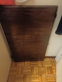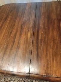 Tavolo allungabile di forma ovale, con quattro gambe torniate e sfaccettate, piana stondata e fascia lastronata. Ha un sistema a binari, su cui si possono appoggiare due tavole aggiuntive, una di 26 ed una di 52 cm (una sola od entrambe, secondo la necessità), che lo trasformano dalla lunghezza originaria di 130 cm a quella di 208 cm. È in discrete condizioni, con qualche segno di tarlo e qualche graffio. Ha una piccola crepa che non ne pregiudica la stabilità o l'assetto. Con un breve restauro ritorna nuovo.