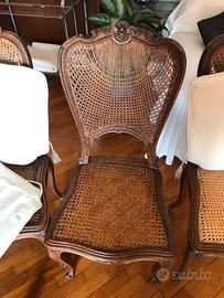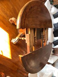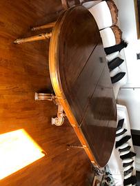 Tavolo ovale allungabile in legno di mogano e n. 6 sedie impagliate. Il tavolo presenta piano di forma ovale con n. 3 allunghi. Dimensioni: 110 x 127 (senza allunghi) - 230 x 127 (con allunghi) dimensione allunghi 40 x 127