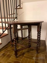 Affascinante e versatile tavolo a bandelle (gateleg) in quercia o rovere, caratterizzato da gambe tornite a torciglione ("barley twist"). Questo mobile, in stile Giacobiano o Edoardiano (fine XIX/inizio XX secolo), offre un design salvaspazio: si trasforma da tavolo ovale a console sottile. In ottime condizioni vintage con autentici segni del tempo. Un pezzo classico, robusto e funzionale. Misure 118x90