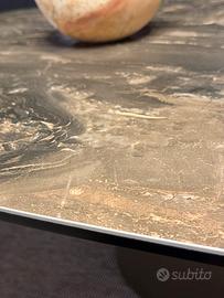 Il piano presenta una finitura raffinata e materica, con bordo sottile che ne esalta la leggerezza visiva, mantenendo al tempo stesso robustezza e stabilità.