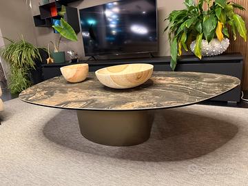 Tavolo ovale di design dal forte impatto estetico, caratterizzato da piano effetto marmo dalle venature naturali e base centrale solida e moderna, ideale per ambienti contemporanei ed eleganti.