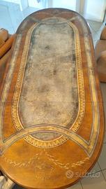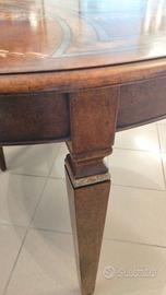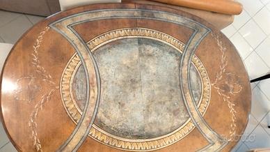 Tavolo ovale in legno massello con decorazioni. È allungabile grazie a due prolunghe in legno con gli decori che possono essere usate sia entrambe o solo una assicurando continuità nel disegno. Le prolunghe se non usate vengono riposte sotto il tavolo grazie a un sistema di guide scorrevoli. Misure lungo 160 cm + le due prolunghe da 60 cm +60 cm Tot 280cm altezza 80cm e larghezza 1.20. Il tavolo è solido, consistente, in vero legno, è un pezzo unico ed elegante adatto anche ad ambienti moderni. Si presta perfettamente ad essere usato sia chiuso che allungato con una o due prolunghe per condividere momenti di festa e con amici fino a 12/14 persone. Se interessati vendo anche 4 sedie in (vera) pelle color crema e gambe in legno.Il prezzo è trattabile ma chiedo di astenersi se non interessati visto il pregio dell oggetto.