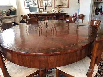 Tavolo ovale in radica di noce, elegante e spazioso, ideale per sala da pranzo o tavernetta. Dotato di 2 allunghe da 55 cm ciascuna, permette di passare comodamente da 8 a 12 posti. Dimensioni:Lunghezza 225 cm – Larghezza 160 cm. Estendibile fino a ulteriori 110 cm Per informazioni: 335 1035336