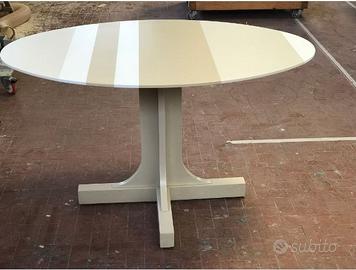 vendo un tavolo con piano OVALE in CORIAN realizzato artigianalmente su misura con 3 diversi colori ( bianco , avorio e tortora ) e basamento a croce in legno laccato . ( 130 x 90 cm )