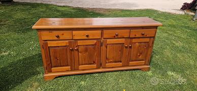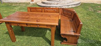 Vendo tavolo in legno, panca e 2 credenze tutto in legno massello Tavolo 1,50 lungo x 0,80 largo x 0,80 alto Panca 1,50 + 0,95 + 0,55 × 0,55 Credenza bassa 1,95 lunga × 0,50 largo x 0,95 alto Credenza alta 105 lunga × 48 larga × 2,04 alto