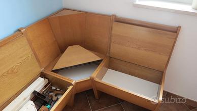 Vendo tavolo, panca angolare in rovere e 3 sedie. La panca ha le sedute con i contenitori. Sedie e panca hanno dei cuscini come da foto. Il tavolo presenta un alone dovuto probabilmente all'appoggio di qualcosa di caldo.