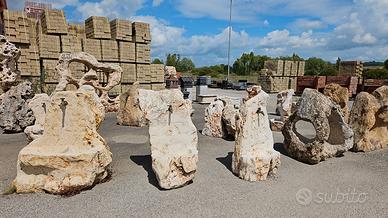 assortimento di tavoli realizzati in pietra , panchine vecchie di recupero , fontane in pietra materiale artigianale pezzi unici