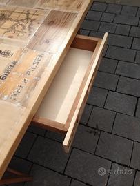Tavolo per cucina/taverna con piano in legno con inserti brand vino/birra/liquori. Misure cm 190x80. Cassetto centrale. Adatto per otto persone