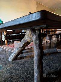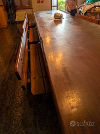 Bellissimo tavolo in legno pregiato IROKO, oggi introvabile, massiccio, pezzo unico, occasione. Completo di n. 8 panche per seduta. Disponibile subito causa trasloco. Ideale per grandi ambienti (locali pubblici, saloni privati ampi) da esterno o interno. Condizioni ottime. Tavolo Misure: lunghezza m 5,90; larghezza m 1,37; spessore cm 7; altezza 80 cm. Panche: n. 6 grandi larghezza cm 1,50; n. 2 capotavola: larghezza m 1,00. Disponibile subito, ritiro in loco a carico dell'acquirente.