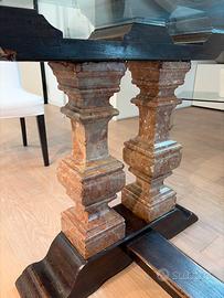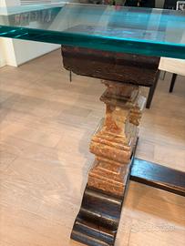 Tavolo con piano di cristallo ,base di legno antico e balaustre di marmo Misure 175 x 79