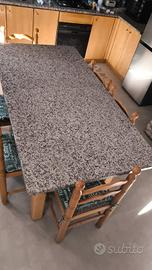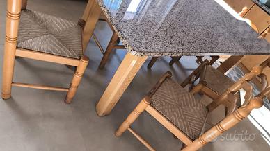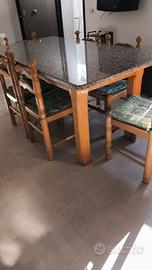 Tavolo in legno con piano in marmo cm 180 x 92 e 6 sedie con seduta in paglia.