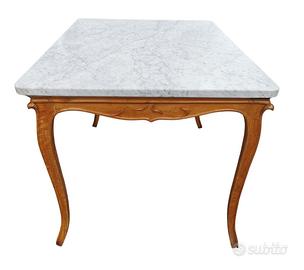 Tavolo, inizi sec. XX, piano in marmo bianco, struttura in acero, fascia centinata intagliata a motivi fioriti, gambe mosse, cm 130x91x h 81, spessore piano cm 3