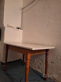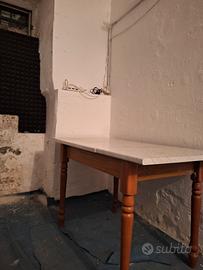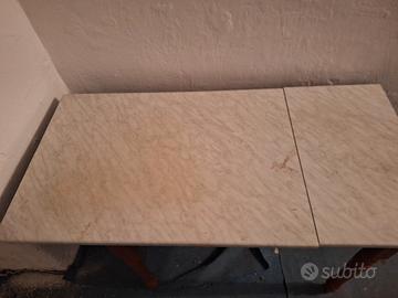 Vendo tavolo con piano in marmo chiaro e gambe in legno massello. Solido e resistente, perfetto per cucina, taverna o cantina. In buone condizioni generali. Dimensioni comode e stile classico.