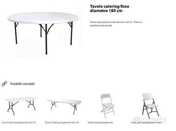tavolo rotondo, tavoli rotondi diam. 122cm 152cm e 180cm Versione quadrata da 87x87 e rettangolare da 152x76, 183x76 cm e 244x76 pieghevole a pacchetto. Tavoli ideali per catering matrimonio ricevimento wedding eventi casa albergo e fiera.