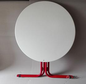 Tavolo pieghevole di Pallucco anni 70, diametro cm 90, struttura metallo rosso piano legno laccato bianco. Per piegarlo basta sbloccare una gamba.