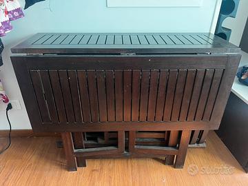 Vendo tavolo pieghevole in legno scuro con 4 sedie abbinate riponibili all’interno, perfetto per spazi piccoli o come soluzione salvaspazio.
