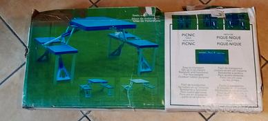 tavolo pieghevole con 4 sedie in plastica e alluminio completo di scatola usato 2 volte. dimensione da chiuso 84x38x10 centimetri , dimensioni tavolo aperto 84x64, dimensione sedie 27x30 con foro centrale per ombrellone.