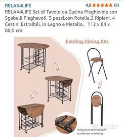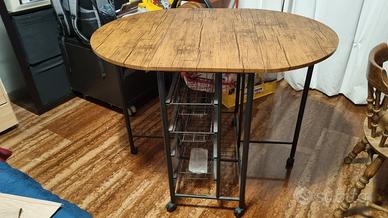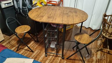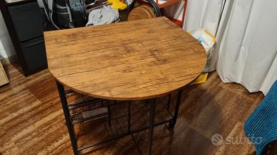 Tavolo pieghevole in stile industriale con due sgabelli. Come da foto in descrizione il tavolo si presenta come nuovo e si presta a diverse configurazioni che ne permettono un utilizzo anche in ambienti poco spaziosi. Una volta aperto del tutto, ci si può mangiare tranquillamente in 4. Il prezzo è di €60 compresi ovviamente gli sgabelli. Ritiro a mano in zona monteverde.