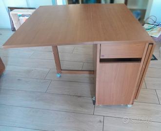 Tavolo Pieghevole Salvaspazio a 2 Ribalte, con cassetto, vano porta sedie, rotelee