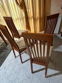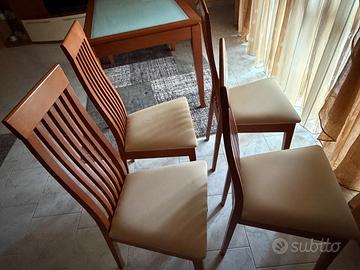 TAVOLO IN MASSELLO RETTANGOARE COLORE CILIEGIO CON BASE IN VETRO MISURA 85X130 ALLUNGABILE A 180 + 4 SEDIE COLORE CILIEGIO CON BASE IN TESSUTO COLORE BEIGE. PREZZO TRATTABILE