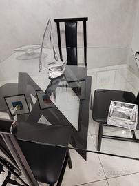 vendo tavolo da pranzo con base triangolare nera e cristallo temperato quadrato più sedute nero lucido con imbottitura in pelle nera.