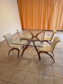 tavolo Porada modello Retró, misure 90x180, in cristallo e noce con quattro sedie Porada modello Anxie, in pelle colore avorio.