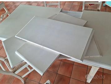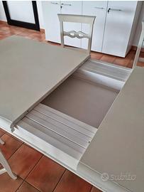 Tavolo Pranzo Allungabile Stile Rustico con sedie. Colore Panna. Lunghezza minima cm. 180. Lunghezza massima cm. 360 (con 4 allunghi da cm. 44 cadauno). Contenitore sotto piano per allunghi. Completo di n. 12 sedie.