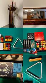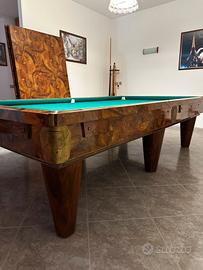 Questo oggetto è un tavolo da biliardo trasformabile, spesso utilizzato anche come tavolo da pranzo, che unisce funzionalità di gioco e arredamento per la casa. Usato pochissime volte è praticamente come nuovo. L'immagine mostra un mobile imponente, un tavolo da biliardo trasformabile in tavolo da pranzo, caratterizzato da una finitura lucida in radica di noce, con intarsi geometrici sul piano. (Anni 70) Stile e Materiali: Il design richiama lo stile Mid-Century o Art Déco, con gambe a piramide rovesciata e un'ampia fascia laterale in legno massello impiallacciato. Funzionalità: “biliardi-tavolo", dotato di copertura rimovibile che nascondono il campo da gioco in ardesia. Compreso di 8 stecche, palline e altri i vari accessori e il segna punti (Tutto mostrato nelle foto) Per lo spostamento e il trasporto se ne dovrà occupare l’acquirente