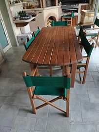 tavolo in doghe di legno cm. 90 x 200 con sei sedie regista in legno e stoffa verde