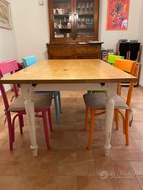 Tavolo da pranzo artigianale. Lunghezza 140cm, allungabile fino a 200cm con due prolunghe da 30cm. Larghezza 90cm, altezza 77 cm. Piano in legno massello colore rovere chiaro. Gambe bianco chabby chic. Ritiro in loco.
