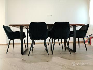 bellissimo grande tavolo in legno massello di acacia, con gambe in acciaio nero, corredato da 6 sedie poltroncine nere. Tavolo in stile moderno, molto solido e con le tipiche venature a vista del legno, come in foto.
