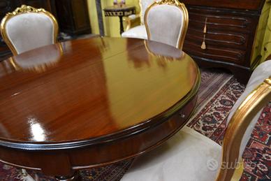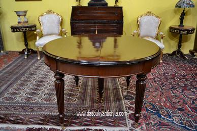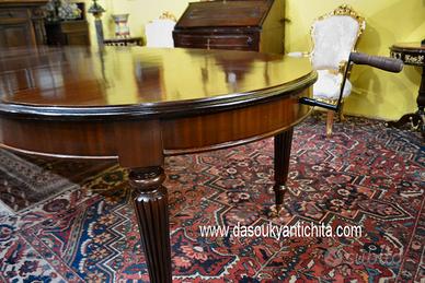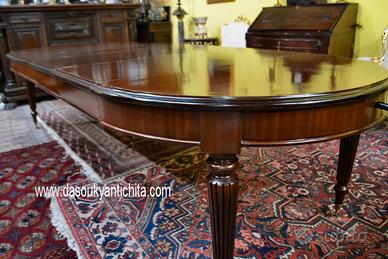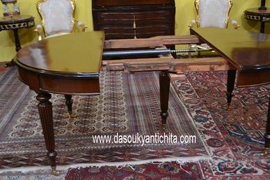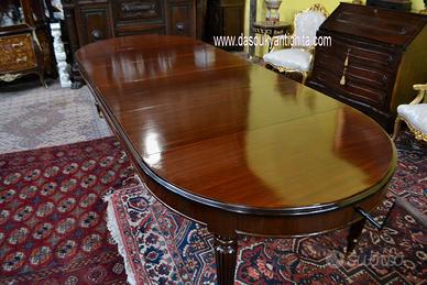 Tavolo da pranzo tondo stile inglese vittoriano lastronato in mogano , provvisto di 4 allunghe facilmente apribile grazie alla manovella fino a 320 cm .Provvisto di cinque gambe ( una centrale per rendere il tavolo stabile una volta aperto) elegantemente intagliate , terminano con ruote a tazza in ottone per facilitare l’apertura .