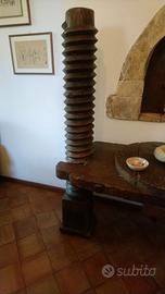 Particolarissimo tavolo consolle ottenuto con legni di frantoio antico con vite da pressa per olive L140xP65xH70-160