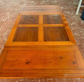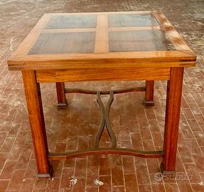 Tavolo primi 900 allungabile con catena centrale a fiocco in legno di mogano chiaro riquadrato sul piano a croce con legno di noce e allunghe in conifera misure 91cm x 91cm, allungato 170cm.