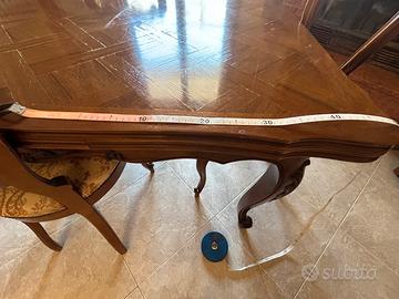Tavolo rettangolare allungabile stile Provenzale, in legno di noce. Presenta piano parquettato e basamento con gambe mosse che terminano con piedini a ricciolo. Presenta 2 allunghe sotto piano di misura 50 cm x 2.