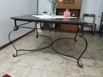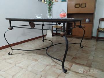 Vendo bellissimo tavolo quadrato da pranzo , un pezzo darredamento solido ed elegante. La struttura è realizzata in ferro battuto scuro , con gambe curve e lavorate artigianalmente, dettagli sferici e incrocio alla base che farantisce massima.