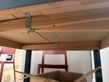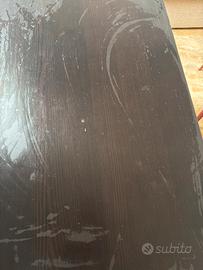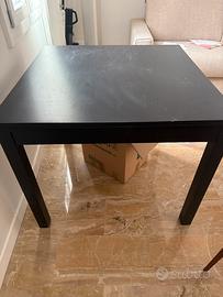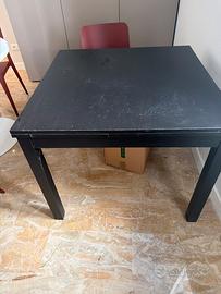 Tavolo quadrato, in una delle foto è bagnato e si vedono le strature nere e marroni, comunque e prevalentemente nero; è allungabile ma mon abbiamo mai provato ad aprire Condizioni ottime, solo qualche graffio come si vede in foto Lo togliamo perche l’abbiamo trovato nella casa che abbiamo comprato ma non sta bene con il nostro arredamento Lunghezza lato: 90 cm