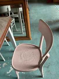 Tavolo quadrato apertura a libro misure chiuso 90 per 90 con sedie con stencil in rilevio due rosa chiaro e 2 verve chiaro anche le gambe del tavolo dono state restaurate