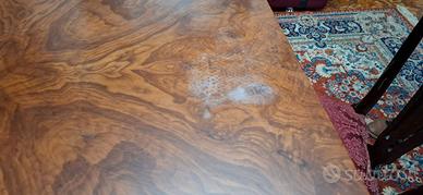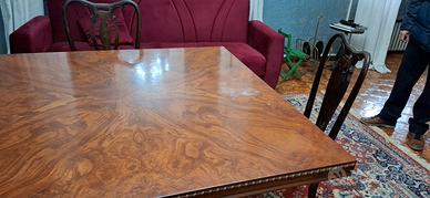 Tavolo quadrato con 4 sedie; il tavolo si allunga e raddoppia le sue dimensioni, diventando rettangolare, è in buono stato, ma la parte superiore è rovinata. Le sedie sono in stoffa, color rosso, in ottimo stato. Vendo anche separatamente sedie da tavolo, ritiro a carico dell'acquirente