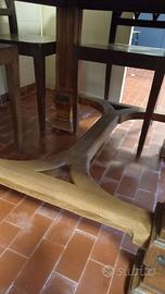 Tavolo in legno quadrato lato 120cm con ripiano in vetro. Struttura intarsiata. Non si può smontare. Misure lato 120, altezza 81