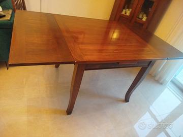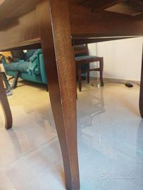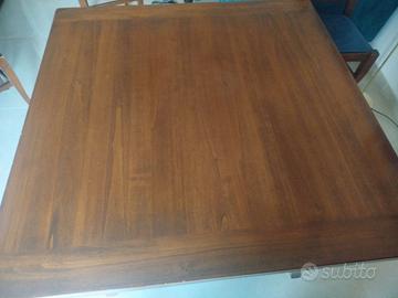 In legno massello, stile arte povera. Quadrato (100 cm x 100 cm) allungabile fino a 160 cm x 100 cm. Chiuso può ospitare fino a 4 persone ed aperto fino ad 8 persone. In discrete condizioni. Sarebbe opportuno lucidarlo.