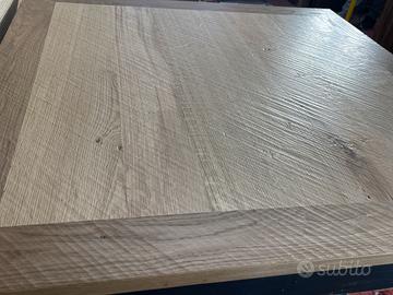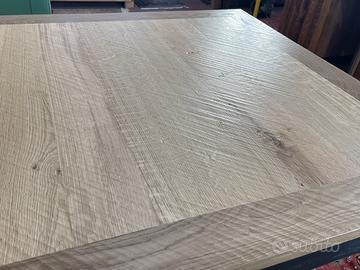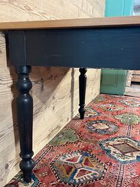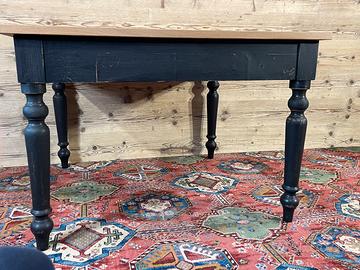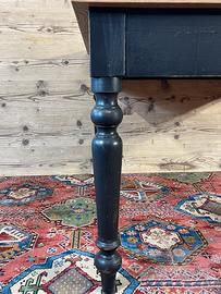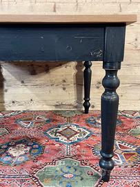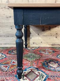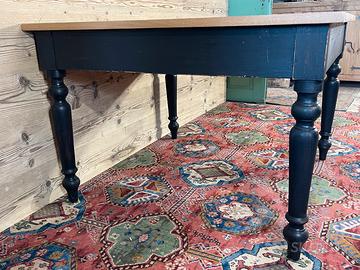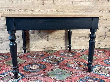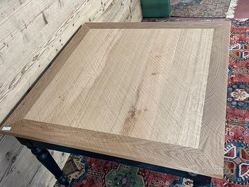 Tavolo con piano in rovere piallato e base di un tavolo antico. In buone condizioni. Il tavolo è stato realizzato,rivisitato, modificando e utilizzando parti di vecchi mobili e legni di recupero. Dimensioni massime di ingombro 115 x 115 cm ed altezza 79,5 cm., Altezza sotto fascia 62 cm.