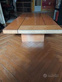 tavolo fine anni 80 inizio anni 90 in pratica di luce laccato con intarsio grafico sul lato destro a parte l'usura il sole ha scambiato un poco il colore del legno è un po' rovinato consigliatissimo per chi sa restaurare è un tavolo di un buon valore artigianale è fatto in legno lunghezza 160 larghezza 80 cm altezza 30 cm disponibile in appartamento su consegna a mano non spedisco l'oggetto si trova a Torino