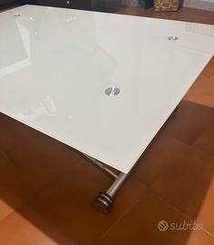 Tavolo tipo Calligaris con altezza regolabile in vetro temperato e acciaio. Misure. Lunghezza: 120 cm. Larghezza 80 cm. Altezza minima: 15 cm. Altezza massima: 70 cm.