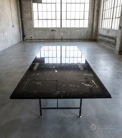 tavolo minimal design contemporaneo con piano in legno intarsiato e vetro effetto marmo, struttura metallica trattata sottile con incroci. Oggetto unico, realizzato e trasformato a mano nel nostro laboratorio. Non è in produzione. Non ci sarà un altro uguale. Per informazioni e acquisto contattaci tramite Subito @mutelab.studio