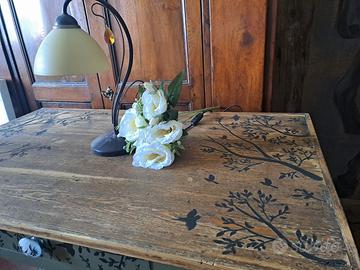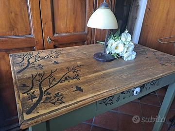 🖥️ Scrittoio vintage restaurato stile shabby chic/botanico Splendido scrittoio d’epoca, restaurato a mano e reso unico con finitura verde oliva opaco e piano in legno naturale che valorizza le venature originali. Decorato con delicati motivi botanici, unisce eleganza e carattere. Dotato di cassetto centrale funzionale con pomello in ceramica decorata e gambe stabili con pratiche ruote vintage. Perfetto come scrivania per smart working, console da ingresso o complemento d’arredo in ambienti shabby chic, rustici o cottagecore. 💰 Prezzo: €180,00 📩 Contattami per informazioni