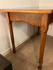 Tavolo rettangolare in legno 70 x 120 cm, altezza 79cm. In ottimo stato. Gambe smontabili per trasporto. Le 4 sedie in legno sono utilizzabili ma con alcuni difetti dovuti all’usura.