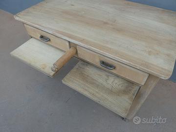 Tavolo fisso rettangolare da cucina con base laccata e top in legno massello di pioppo, corredato da due cassetti, due assi frontali ed un mattarello estraibile. Presenta segni d’usura – necessita di piccoli interventi di restauro (foto). Anni ’50.