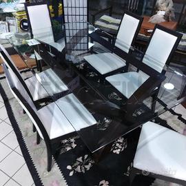 TAVOLO RETTANGOLARE PIANO CRISTALLO TEMPRATO 6 SEDIE PELLE BIANCA