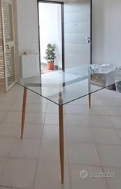 Vendo tavolo rettangolare con piano in vetro temperato trasparente e gambe effetto legno.